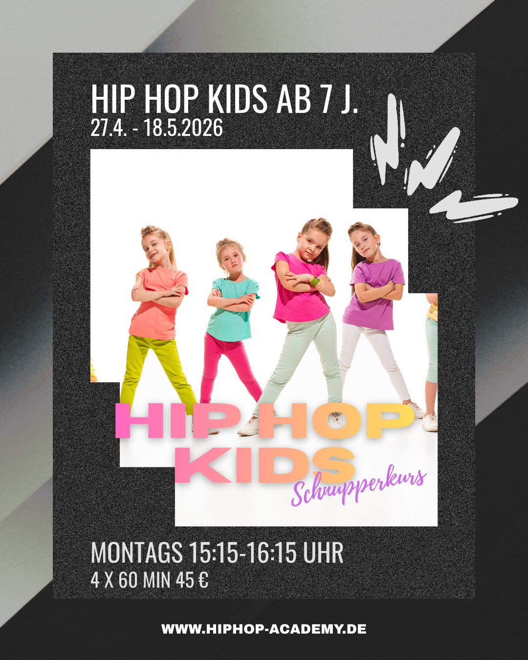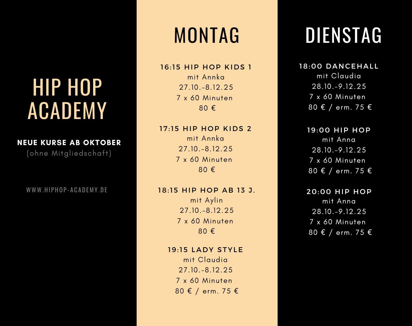 Die Hip Hop Academy ist Münsters erste Tanzschule, die sich auf den Bereich Hip Hop Tanzen spezialisiert hat. Unser Stundenplan umfasst Trainings für unterschiedliche Altersklassen und Niveaus. Insbesondere im Anfängerbereich bieten wir ein umfangreiches Angebot. Gerne beraten wir Dich auch telefonisch oder per Mail.