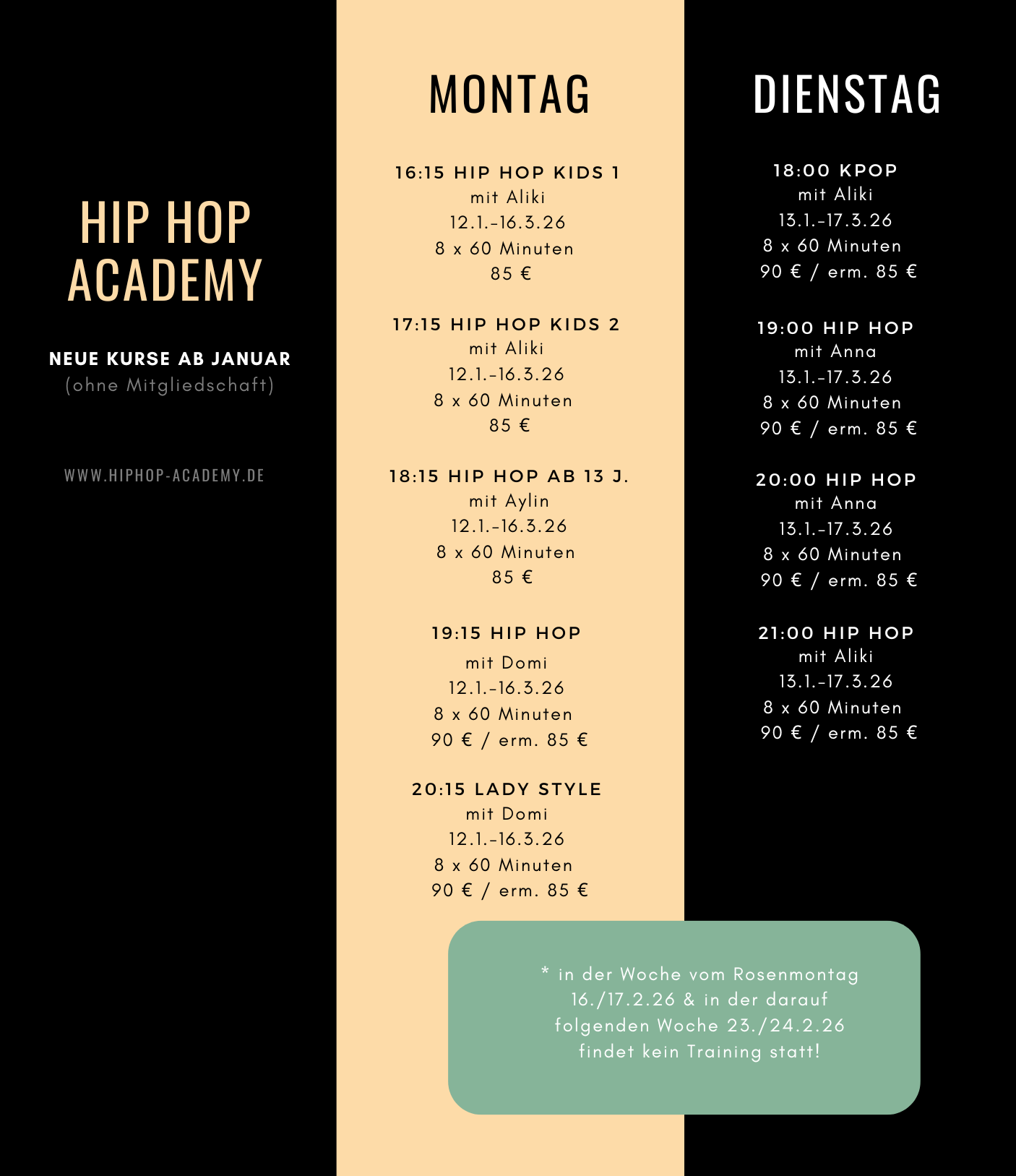 Anmeldungen für Kompaktkurse nehmen wir nur per Email entgegen. In der Kursbestätigung stehen nochmal alle wichtigen Infos zusammengefasst (Kurs, Kurszeit, Preis, Adresse & weitere Infos). Probetrainings sind aktuell leider nur eingeschränkt in Kursen, die nicht vollständig ausgebucht sind, möglich. Auf unserem Instagramkanal erfahrt ihr mehr über die Stile und Trainerinnen. Außerdem eignen sich die Kompaktkurse auch gut zum Reinschnuppern und Kennenlernen.